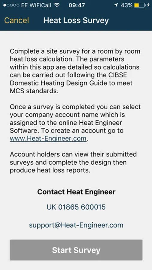 1 - Heat Loss survey, designed to meet BS EN 12831, CIBSE Domestic Heating Design Guide and MCS standards. When the survey is completed you can send it to your account at www.heat-engineer.com