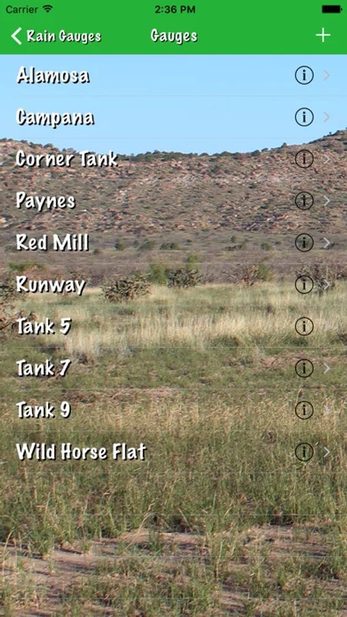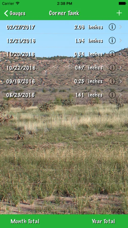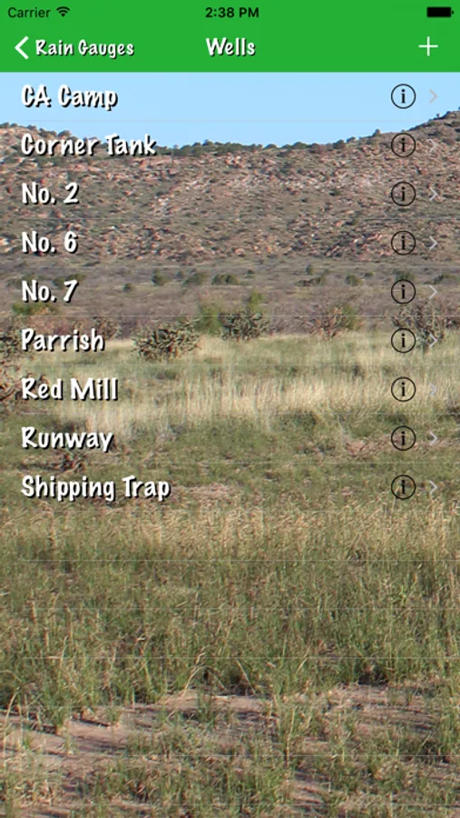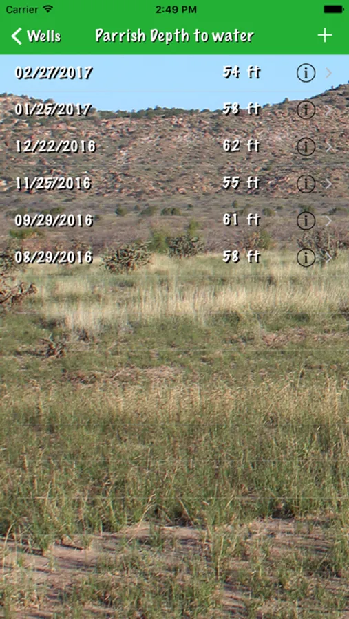 A simple data collection app for iPhones and iPads created for ranches with multiple rain gauges or water wells positioned around the property. The user enters the name of each gauge or well, which is then displayed in ascending alphabetic order. Upon selection of a gauge or well the user then enters the rainfall noted for that gauge or the depth to waterford that well, which is then presented in the order of most recent observation to earlier observations. Should the user wish to export data from this app, the iTunes File Sharing mode may be used to export SQLite files which may then be imported into an SQLite file reader or manipulator on the user's computer.