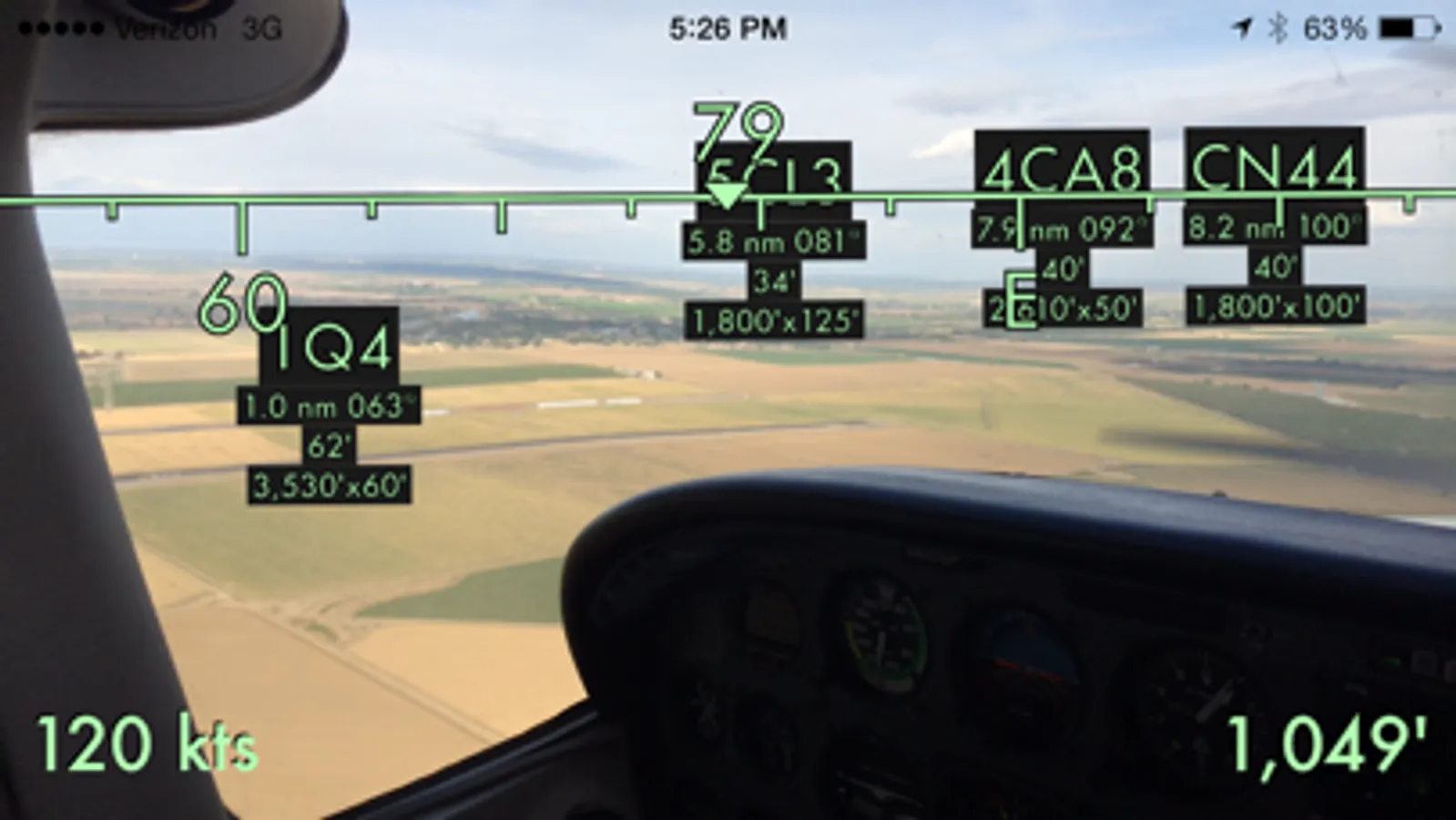Augport shows you a heads up display of airports and associated essential information. You'll know distance, bearing, elevation and runway length of fields nearby. Filter results to paved runways over 10,000' if that's what you need.