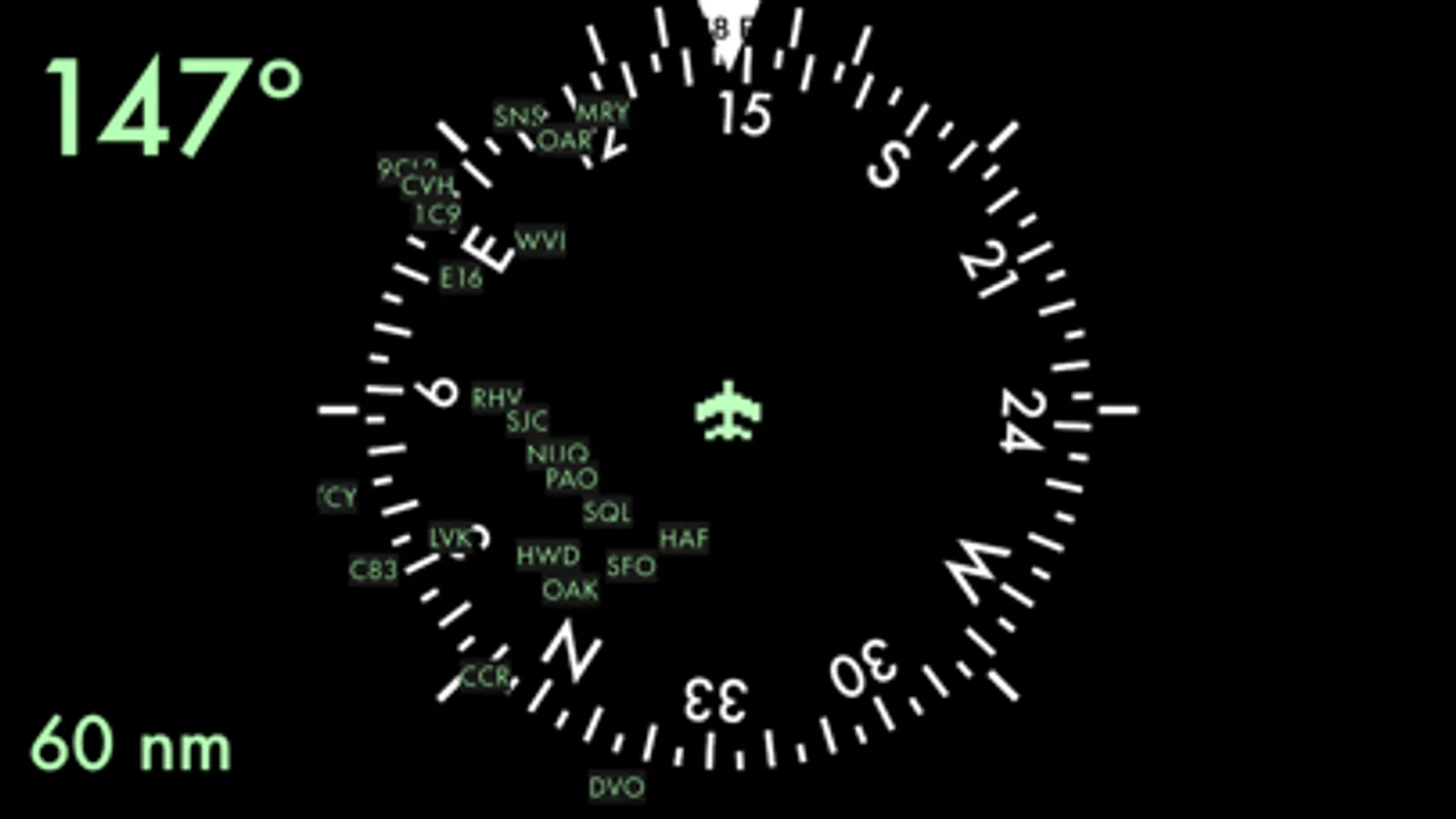 A secondary screen provides a bird's eye view of surrounding airports. The nearest acceptable landing spot may be behind you.