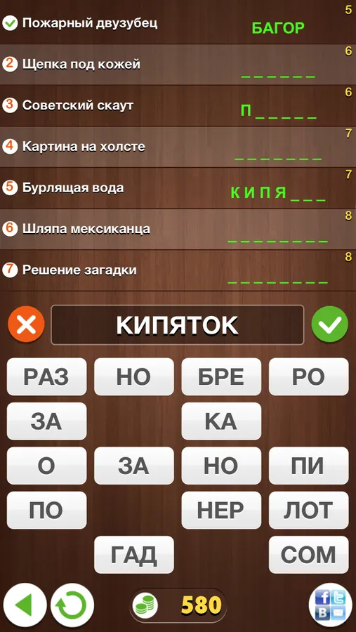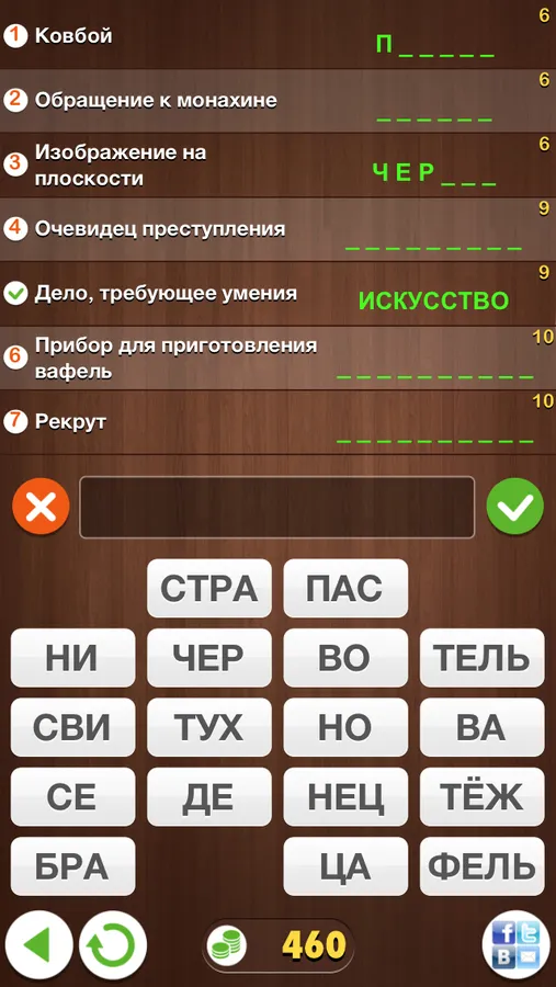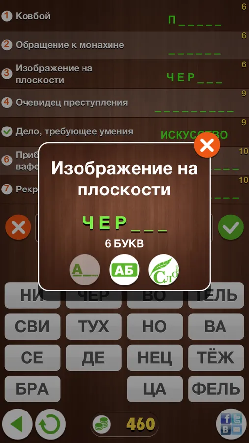 В игре Вам предстоит не только найти ответы на каверзные вопросы, но и вводить ответ, используя наборы букв разбитых на слоги, по правилам переноса, или на пары и триады.