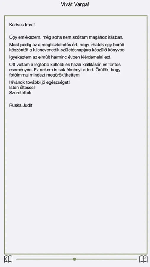 Ez a kis könyv a köszöntés könyve. Olyan személyek írták, akik sokat köszönhetnek Varga Imrének szobrai által, kollégái, szintén szakmájámak kiválóságai, olyanok, akik sokat foglalkoztak művészetével, társművészetek képviselői, a magyar szellemi élet jelesei, akik tanultak tőle, s persze barátok is.