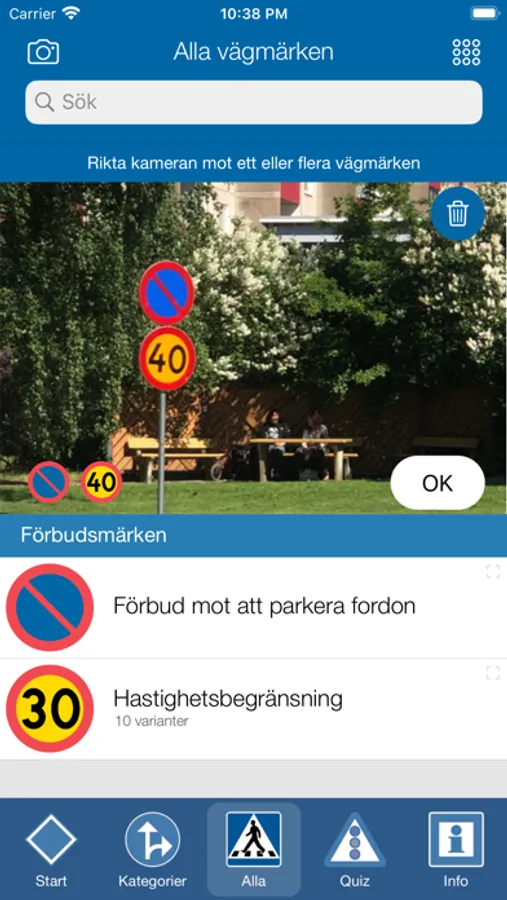 Sökning kan även ske med kameran. Tryck bara på kameraknappen och rikta den mot vägmärkena så fångas de och letas upp helt automatiskt.