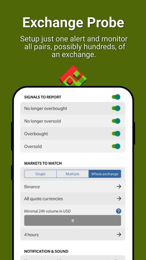 - Setup just one alert and monitor all pairs, possibly hundreds, of an exchange.