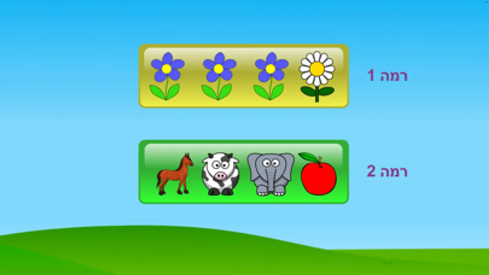 הילד צריך לבחור את התמונה שלא קשורה לתמונות האחרות. הוא צריך להבין מה משותף לתמונות ולמצוא איזה תמונה לא דומה לאחרות.