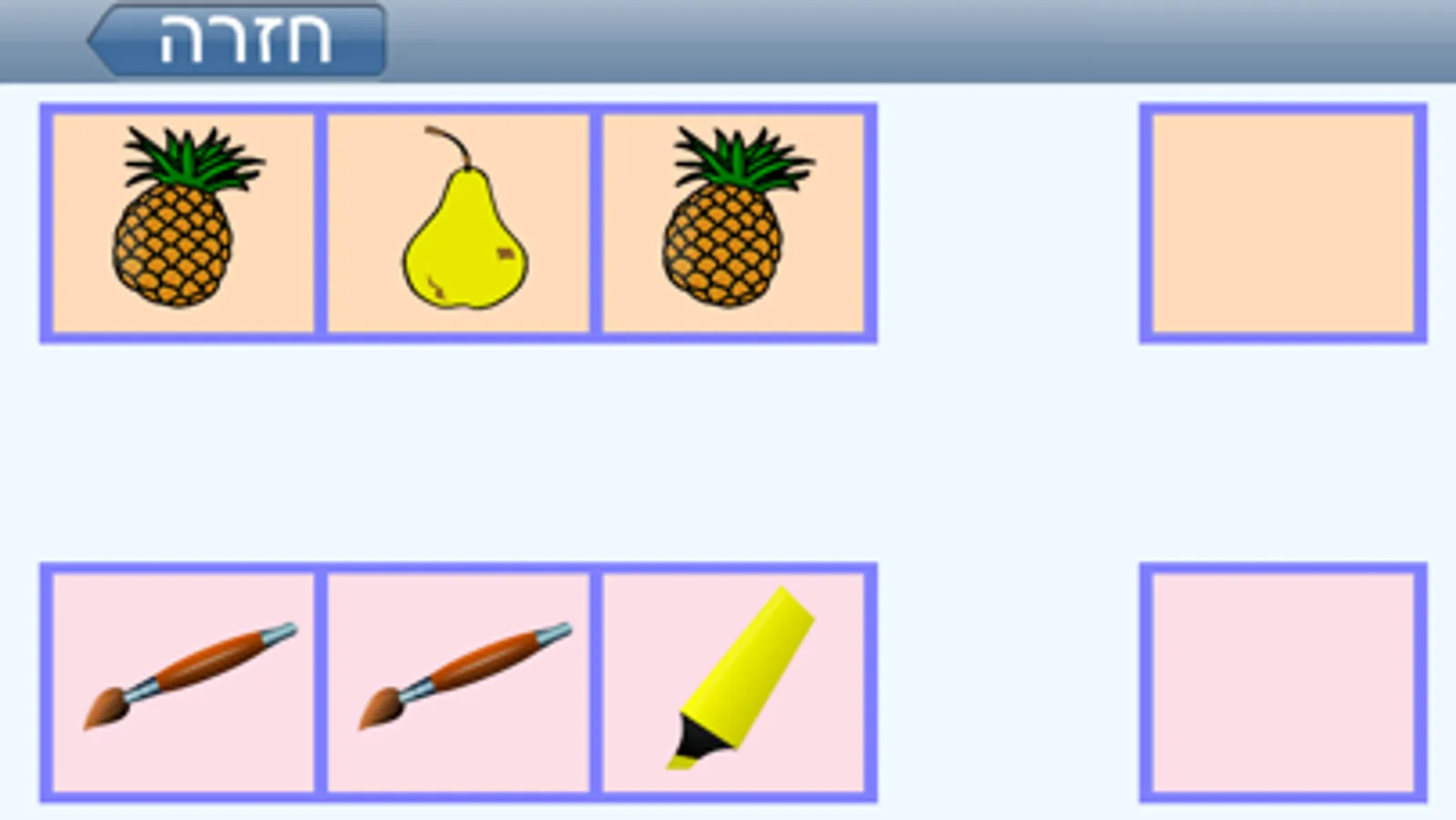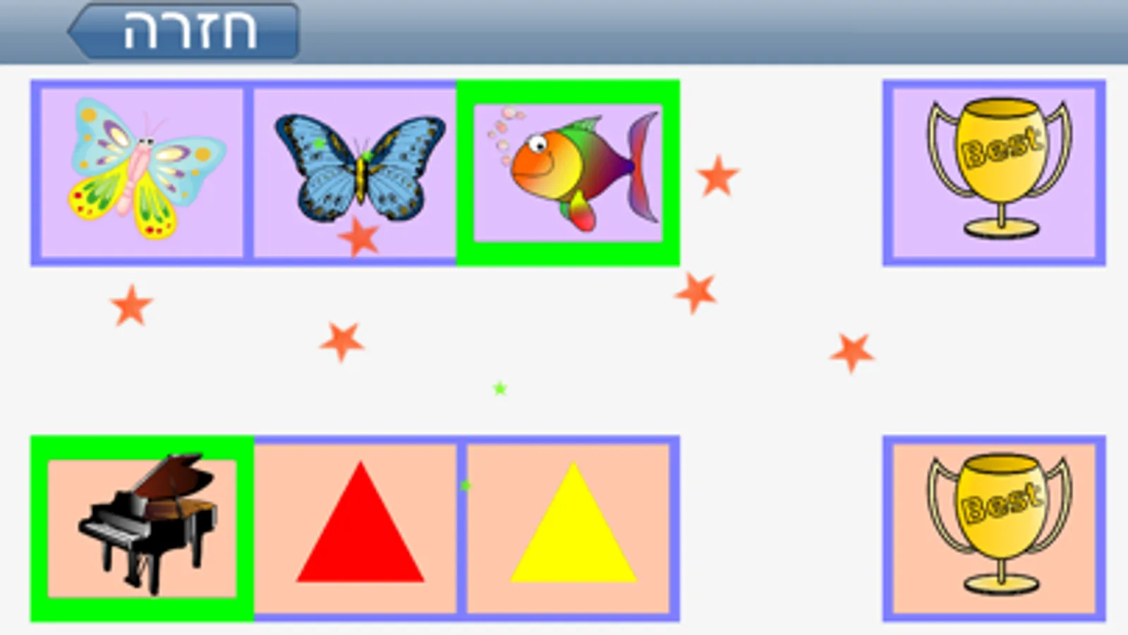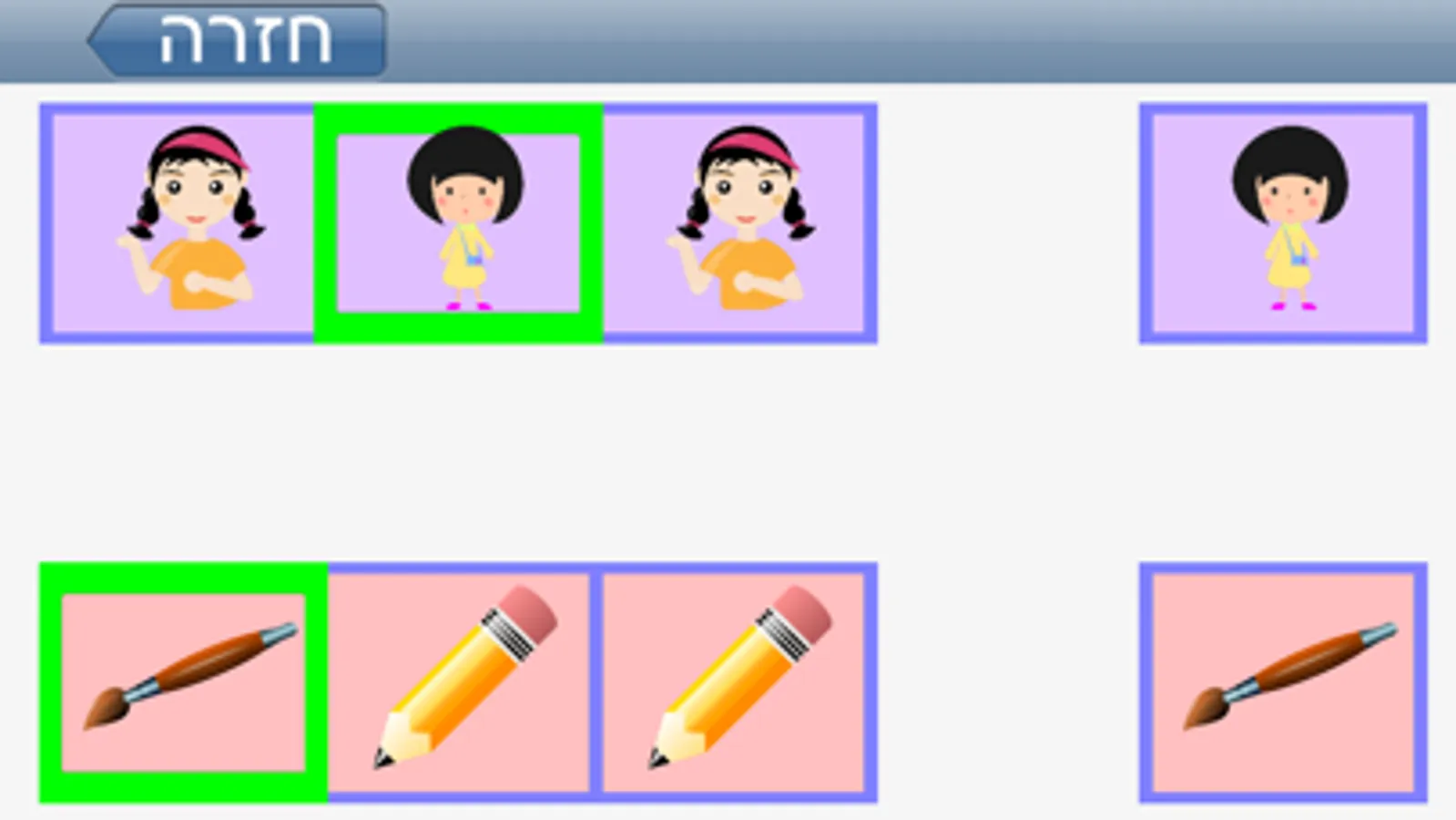 הילדים משחקים ולומדים במשחק מצוין ומאוד חינוכי שמשפר את היכולת הקוגניטיביות, השפה ואבחנה בין הפריטים. בנוסף לומדים להכיר את השמות של מה שבתמונה.