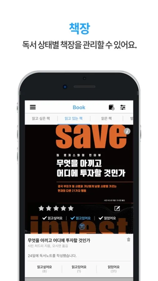 - 독서 상태에 따라 읽고 싶은 책, 읽고 있는 책, 읽은 책 3가지의 책장을 제공합니다.
