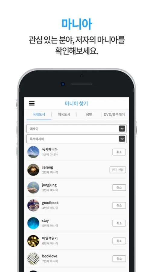 - 독서취향이 비슷한 친구와 관심 분야 책을 추천받을 수 있습니다.