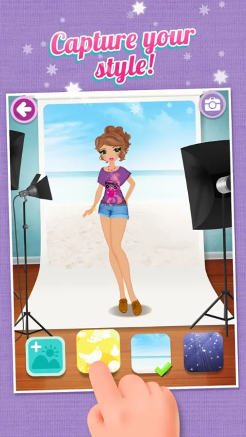 Love your creation? You won't need to say goodbye to it. Every piece you create is a new addition to your wardrobe. Add the finishing touch with beauty accessories and you're ready for the photoshoot. Choose from beautiful backgrounds, or use your device's camera to take your own. Capture the perfect pose and voila!