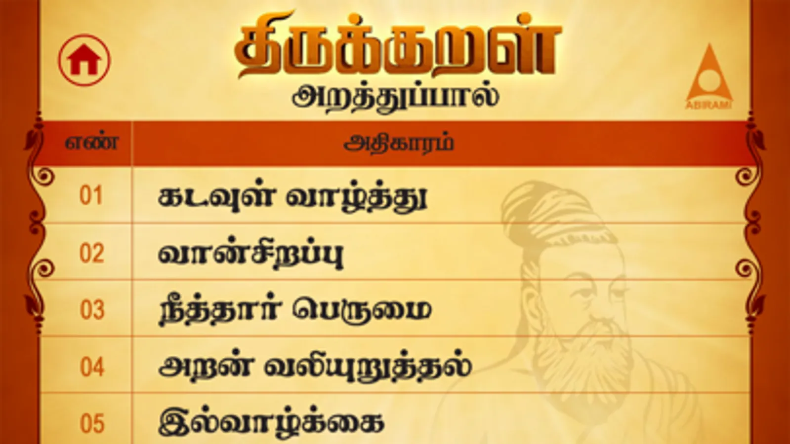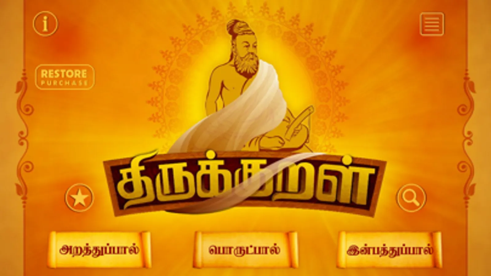 Thirukkural is a wonderful application with all collection of 1330 Tamil Couplets organised into 133 chapters. This app is wonderfully organized for you to enjoy each kural.
