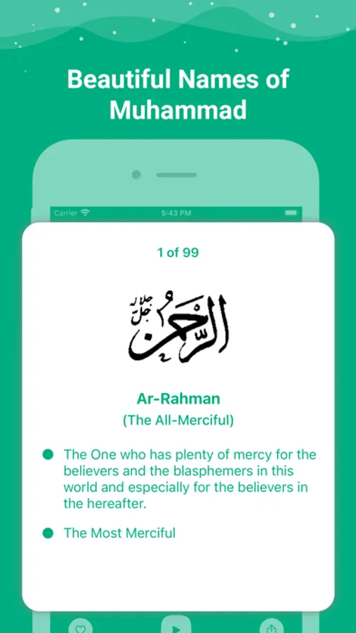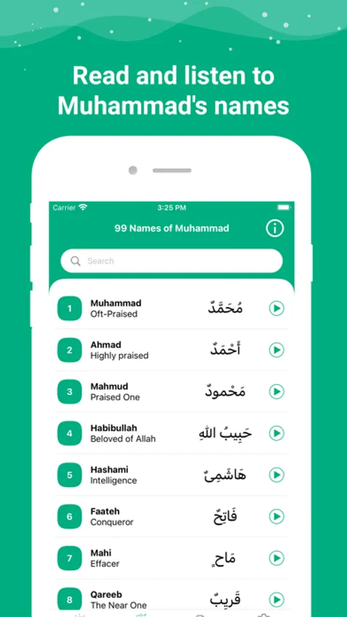 • Read the English Translation of the Meaning of Qur'an in Description for each name.