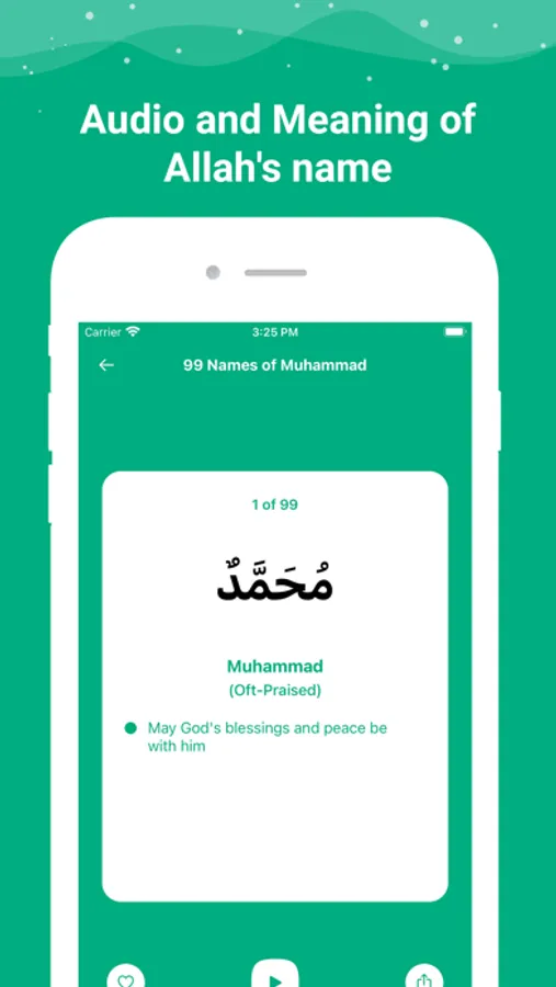 • Provides the list as well as detail with the meaning of Allah and audio to play.