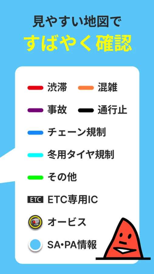 ・渋滞・混雑・事故・通行止め・チェーン規制などの渋滞情報、規制情報を色分けして表示します。