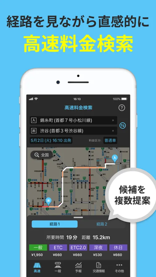 ・入口IC、出口ICを指定することで、高速道路の料金が確認できます。