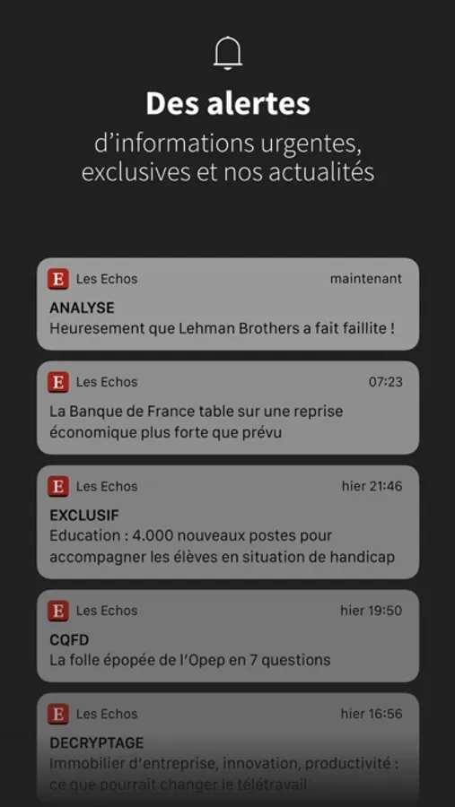 Avec l’application Les Echos, restez au courant des dernières actualités françaises et étrangères, notamment économiques, grâce aux contenus exclusifs proposés par notre rédaction :
