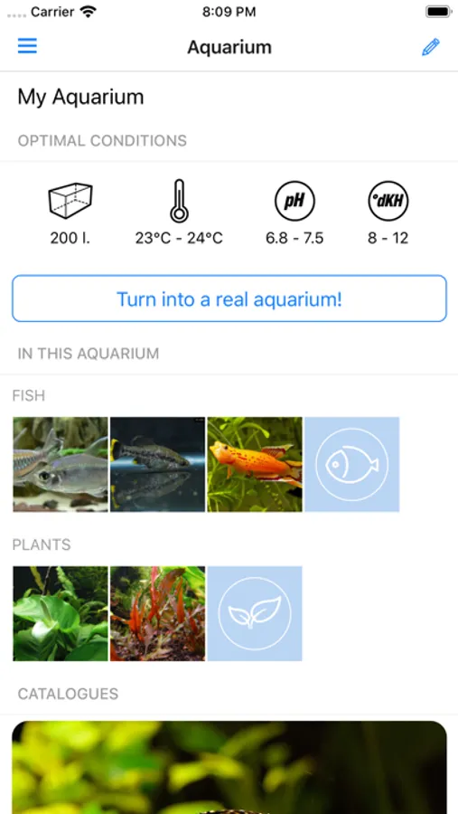 You can follow a simple step-by-step guide and setup a real aquarium based on the selection of fish and plants that you made in the app.