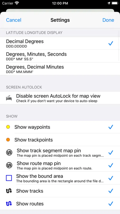 - Hide or show the waypoints, track points, routes or tracks on the map.