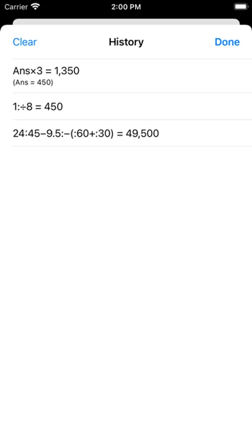 Moreover, if you tap a computation on the screen, the app copies a computation string to the pasteboard (clipboard). If you tap numerical expression, you can edit the expression. When the expression section is blank, tapping on it will display the input history (up to 1,000 entries) in a list.