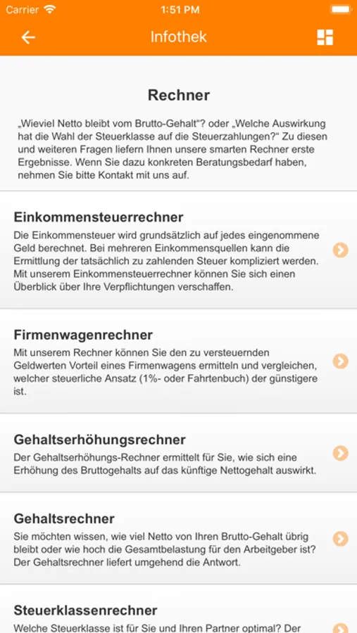 Auch zu ausgewählten steuerrechtlichen Fragestellungen hält die App Informationen bereit: Was ist bei der Führung eines Fahrtenbuchs zu beachten? Welche Möglichkeiten steuerbegünstigter Gehaltszuwendungen an Arbeitnehmer gibt es? Zu diesen und weiteren Themen liefert Ihnen unsere App die Antworten zum sofortigen nachschlagen.