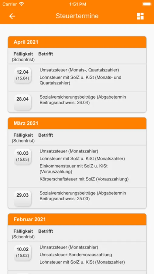 Sie möchten wissen, wann welche Steuerzahlungstermine anstehen? Ob z.B. Einkommen- oder Umsatzsteuervorauszahlung, Lohnsteuer oder Gewerbesteuer, in der App finden Sie die entsprechenden Termine.