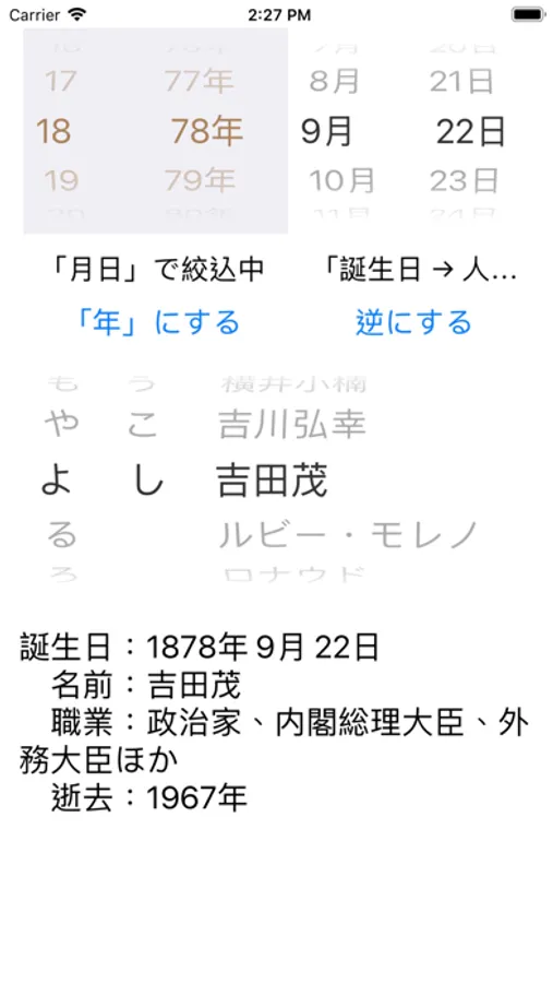 誕生日からの人名絞り込み、人名からの誕生日逆引き、どちらも可能です。