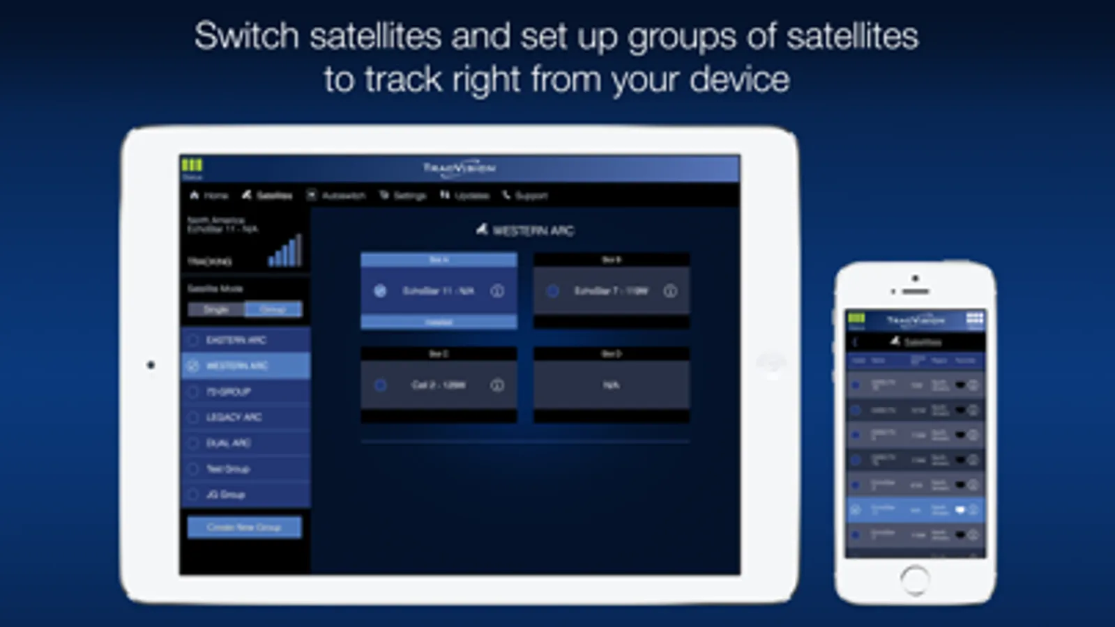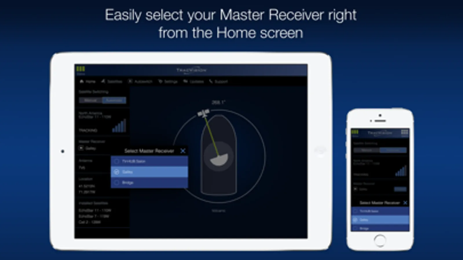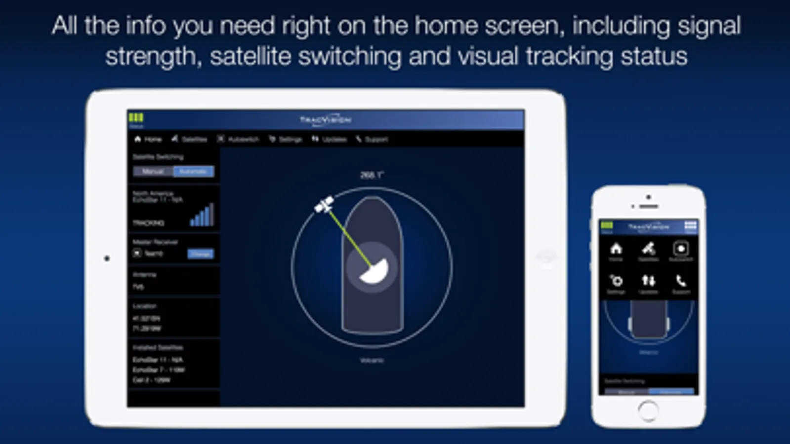• View antenna status, signal strength, and satellite being tracked
