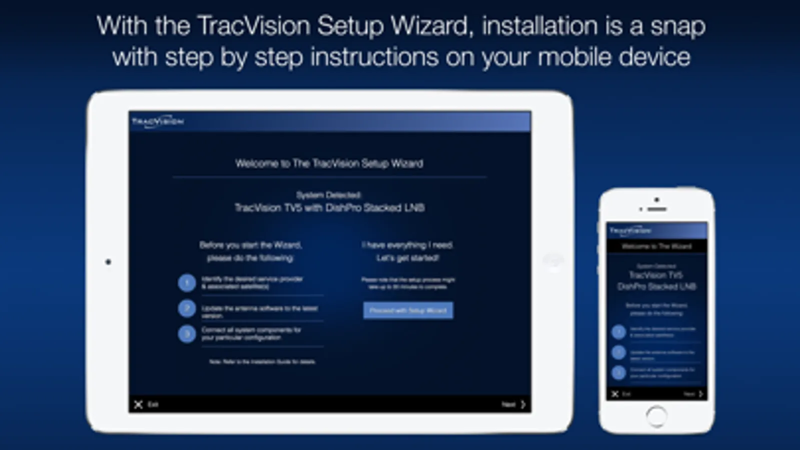 • Access a wizard for easy installation and setup of your TracVision system