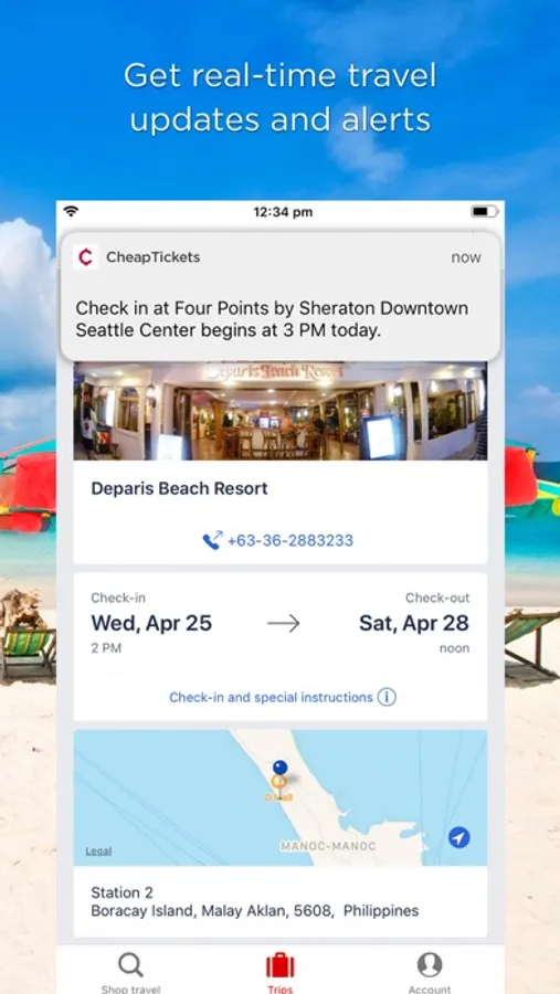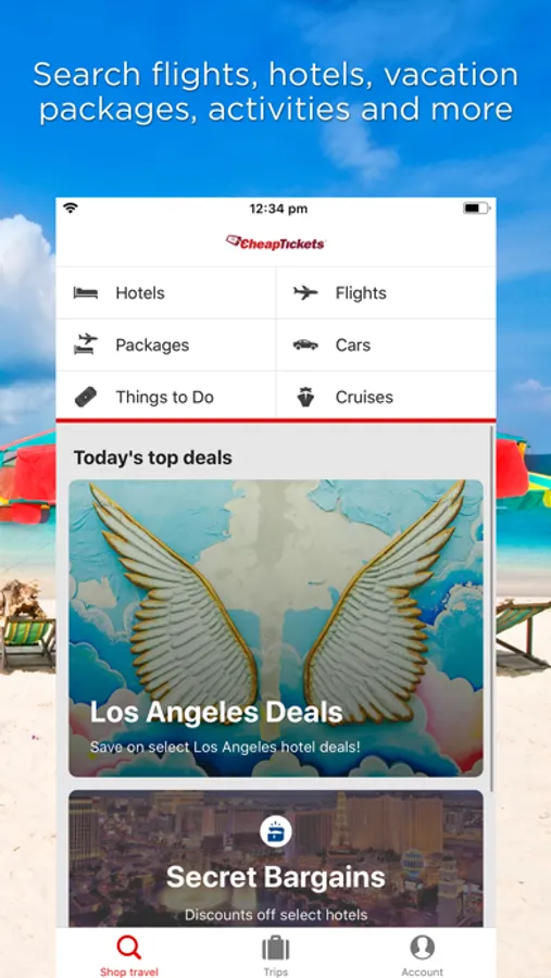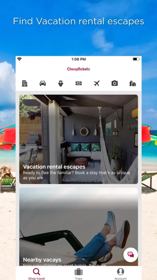 The CheapTickets app for iOS offers the ability to search and securely book the same selection of cheap flights, hotel rooms, rental cars and activities offered on CheapTickets.com. Plus, join our CheapCash loyalty program and start earning CheapCash on select flight bookings that you can instantly apply toward hotels in the app! Use our convenient travel tools to view upcoming trip details, access address information and get maps for directions, receive alerts for flight delays, gate changes, hotel check-out times and more. You can also find last-minute hotel rooms nearby and save 40% with mobile exclusive hotel rooms!