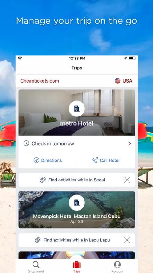 CheapTickets offers a simple, secure booking process, and 24x7 customer support. Use our convenient travel tools to view upcoming trip details, access address information and get maps for directions, receive alerts for flight delays, gate changes, hotel check-out times and more.