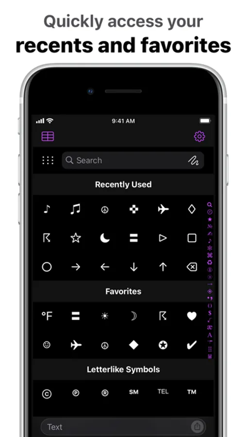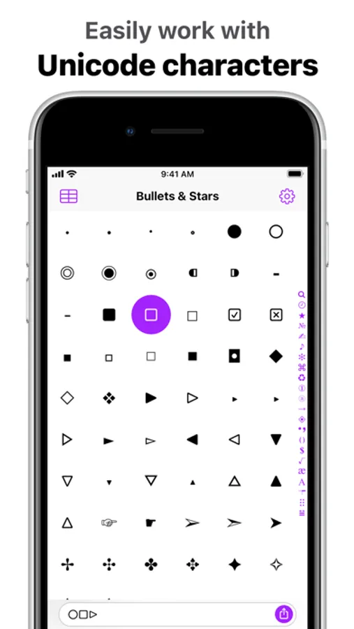 UniChar features thousands of symbols organized neatly into categories as well as a complete Unicode table.* You can quickly search for the symbol you’re looking for by name or by drawing, type symbols in any app with the custom keyboard, and collect your favorite symbols to access them even quicker.