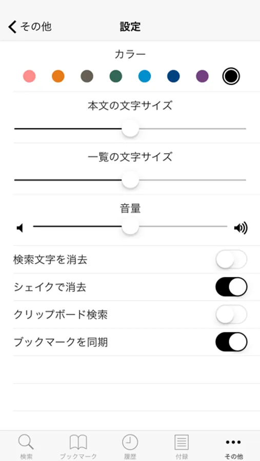 - 本文と一覧の文字サイズの変更、音量調整、検索文字消去