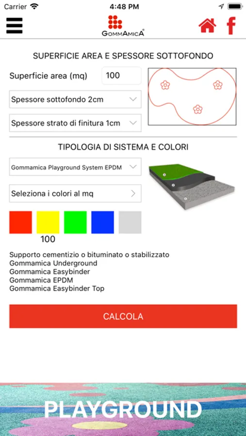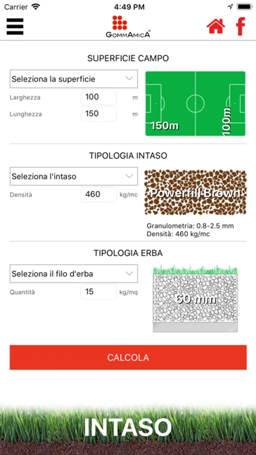 A modern application created to calculate with simplicity the right quantity of infill rubber granules that are necessary for the realization of synthetic turf fields and the exact amount rubber and binder for safety surfaces.