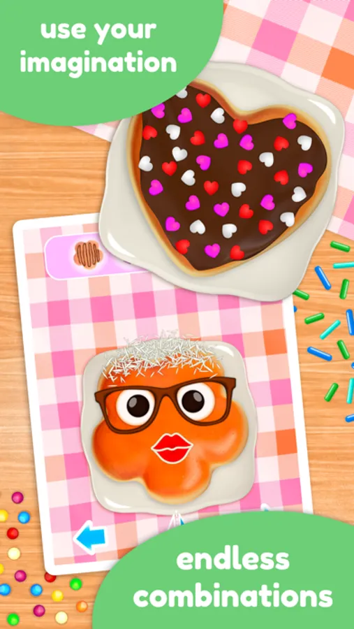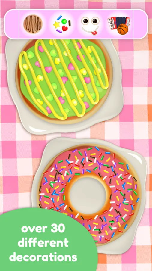 Once the donut is perfectly fried you can decorate it. There are many colorful glazings, toppings, sweets, toys, sprinkles and other decorations to choose from, so your donut will never look the same. For some extra laughs, you can also make them look like funny faces. Making donuts has never been so fun and your creativity is the only limit!