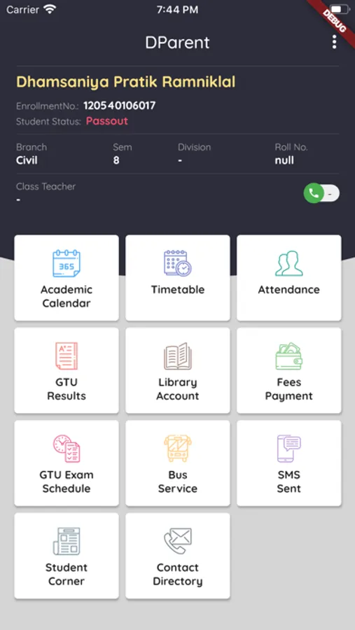 » Profile - It includes information like Branch, Current Semester, Roll Number, Division, Address, City, Pincode, Taluka, District, State. It also includes contacts details given by the students like phone number, email address, etc.