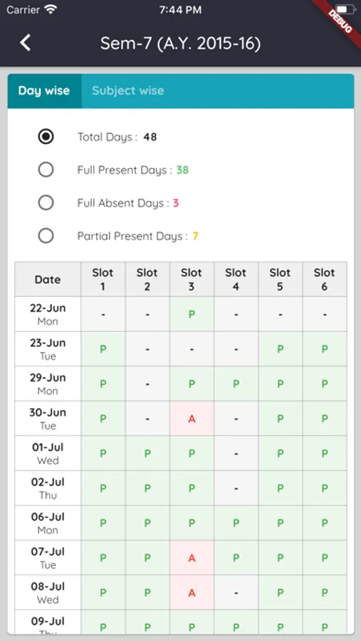 In the Month View tab, you will be able to see day wise attendance for the lectures conducted and attended. By clicking on any one date for the given month, it shows you your lecture wise presence.