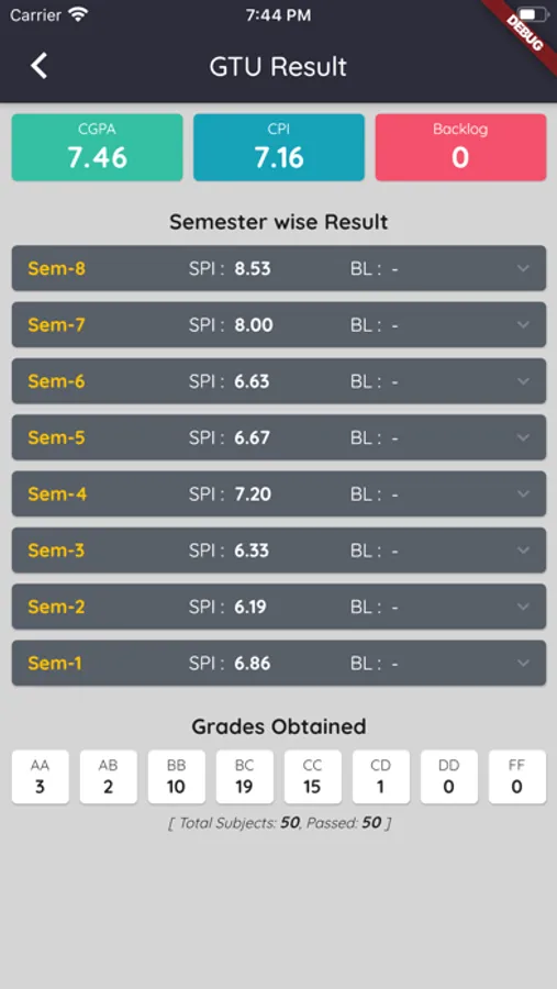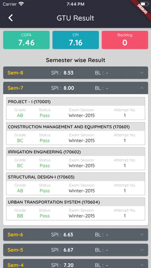 » Results - It shows semester wise Semester Performance Index (SPI), for the GTU Result. It also shows Mid Sem Result semester wise, Cumulative Performance Index (CPI), Cumulative Grade Point Average (CGPA), Backlogs, Subject wise Grade and pass/fail status.