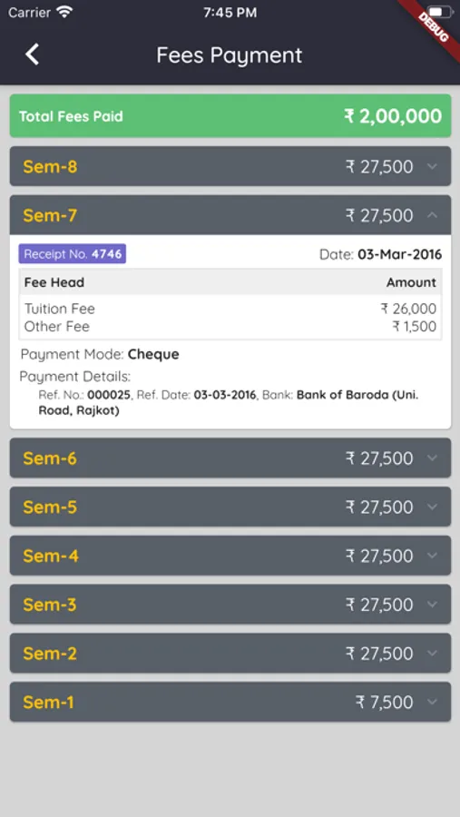» Fees - Shows you information of semester wise tuition fees and bus fees (if applicable) paid. Fees Details includes Receipt Number, Receipt Date, Mode of Payment, Amount Paid, Bank Name and Cheque number (if feed paid by cheque).