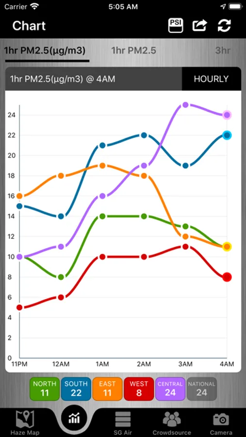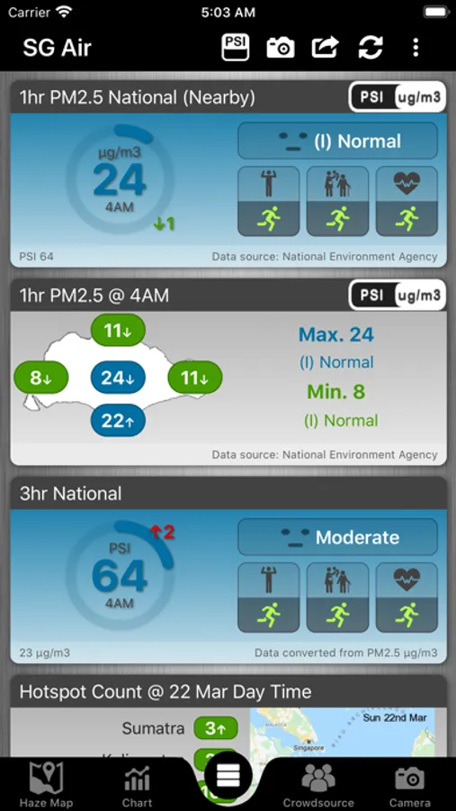 - Line charts with 24hrs data including 24hr PSI/AQI, Sumatra Hotspot Count, 1hr PM2.5, 24Hr PM2.5, 24Hr PM10, 24Hr SO2, 1Hr NO2, 8Hr O3 and 8Hr CO.