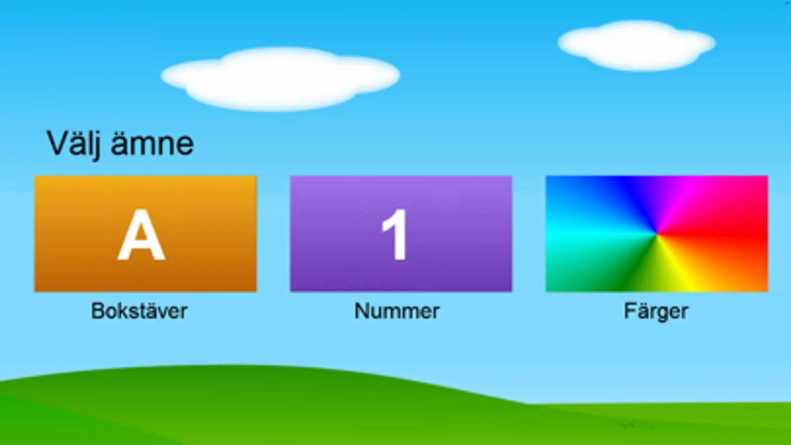 Spel för barn för att lära sig känna igen Svenska bokstäver, Svenska nummer och Svenska färger.