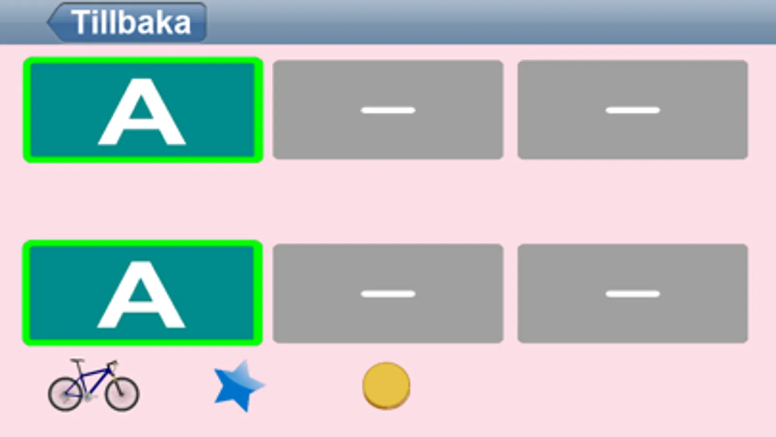 * Ihopkoppling av samma färg- Högre svårighetsgrad. Alla kort är i samma färg. Barnet matchar bara genom bostavsigenkänning. Välj kort med matchande symbol- Utan hjälp av färg på korten