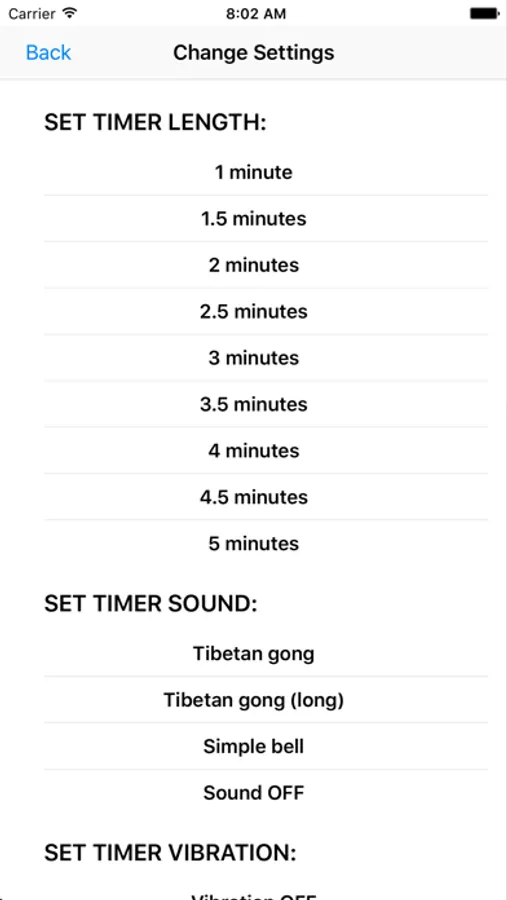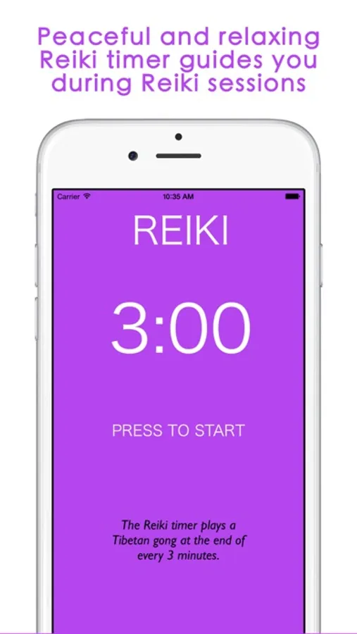 Select one of the 9 different timer lengths ranging from 1 to 5 minutes: The timer counts down and sounds a Tibetan gong or bell when it reaches zero. It automatically repeat itself until your Reiki session has ended. We included 2 Tibetan gongs, a simple bell and a completely silent timer. You can set the app to vibrate once, twice or not at all when the timer reaches zero.