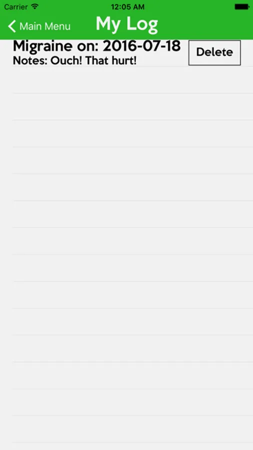 MyMigraine logs all of the users previous migraines in the "My Log" page.
