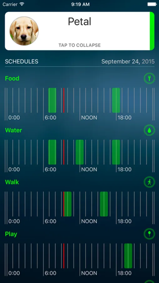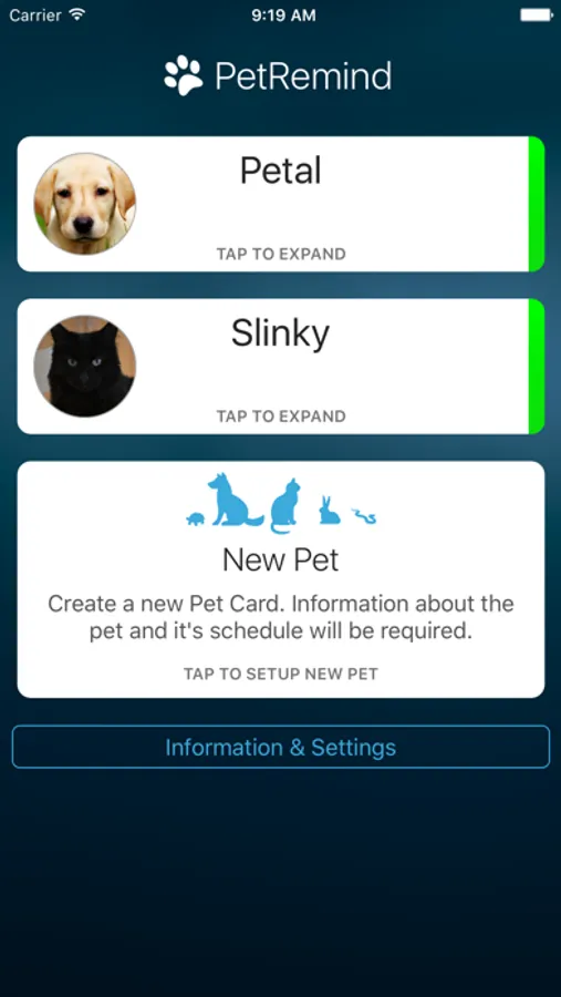 It's pretty simple really. To start with, create a Pet Card for your pet. This will contain the pet's name and photo as well as information about your pets schedules (e.g. feeding, walking, medication, etc).