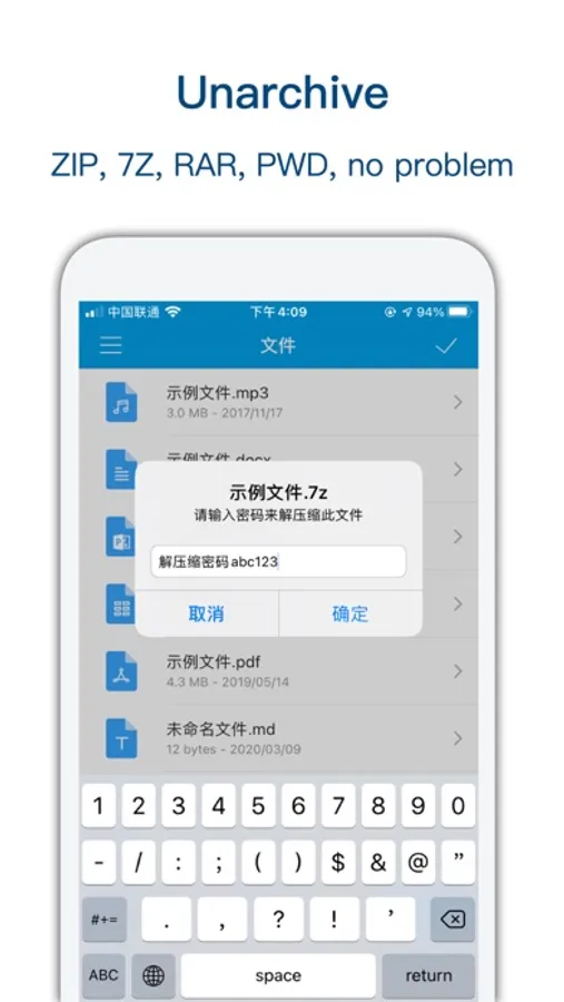 You can compress and decompress files in 7z, rar, zip, dms format, no problem with password.