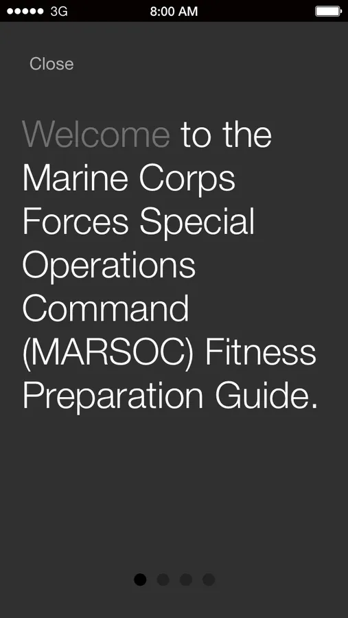 This app is focused on the physical fitness portion of this ideology: improving physical performance through training and nutrition. It provides photographs and descriptions of exercises used by MARSOC, and will help prepare candidates for the physical aspects of the Assessment and Selection process. Upon arriving at A&S, candidates are expected to have completed this 10-week program.