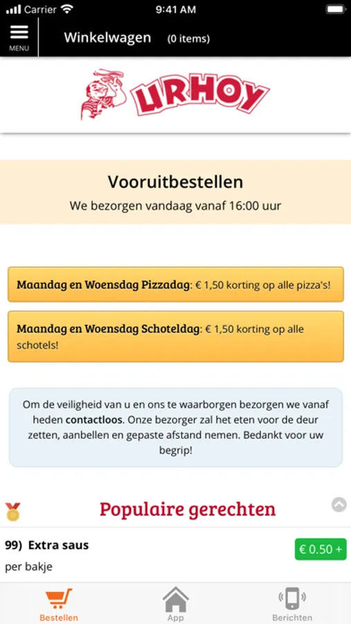 Download onze app en blijf op de hoogte van het laatste nieuws en de nieuwste acties, aanbiedingen en kortingen. Via onze app kunt u onze menukaart bekijken en direct vanaf uw telefoon uw bestelling plaatsen. U kunt via de app ook met iDEAL betalen!