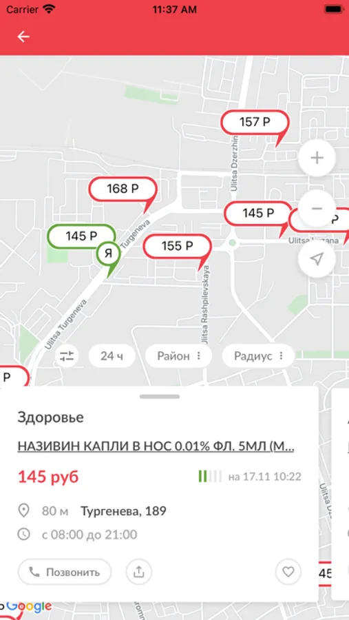 - представление результатов поиска в виде списка и цен на карте, сортировка по расстоянию и стоимости, удобная фильтрация;