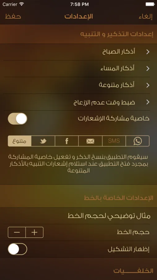 ● يتحكم المستخدم فى إعدادات التنبيه ( كتفعيل الصوت ، ضبط الأوقات ... إلى آخره ) مع العديد من الإعدادات الأخرى