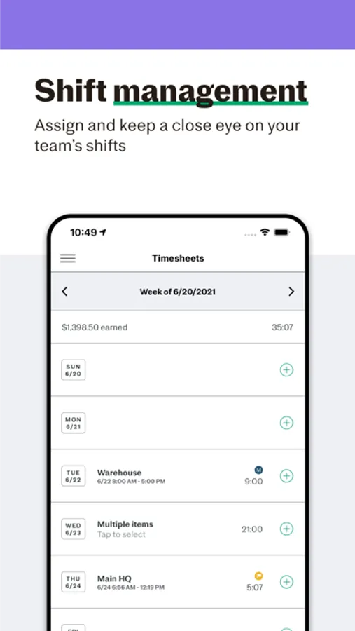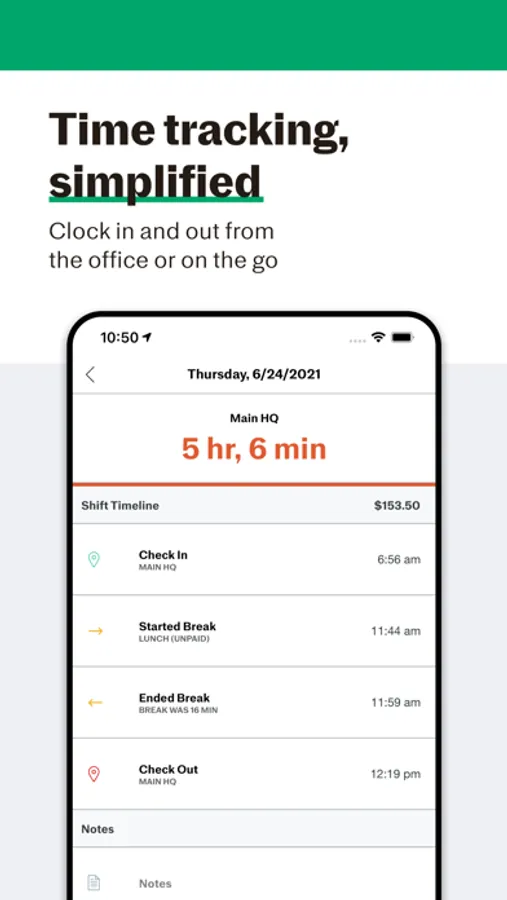 • Clock in and out from the office or on the go via mobile, tablet, laptop, or Slack