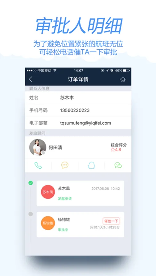 4、订单审批灵活管理:通过审批规则的不同设置,设置订单相关审批规则,规则设置灵活,可以根据实际情况给不同的员工设置不同的规则,满足实际出行的需求;